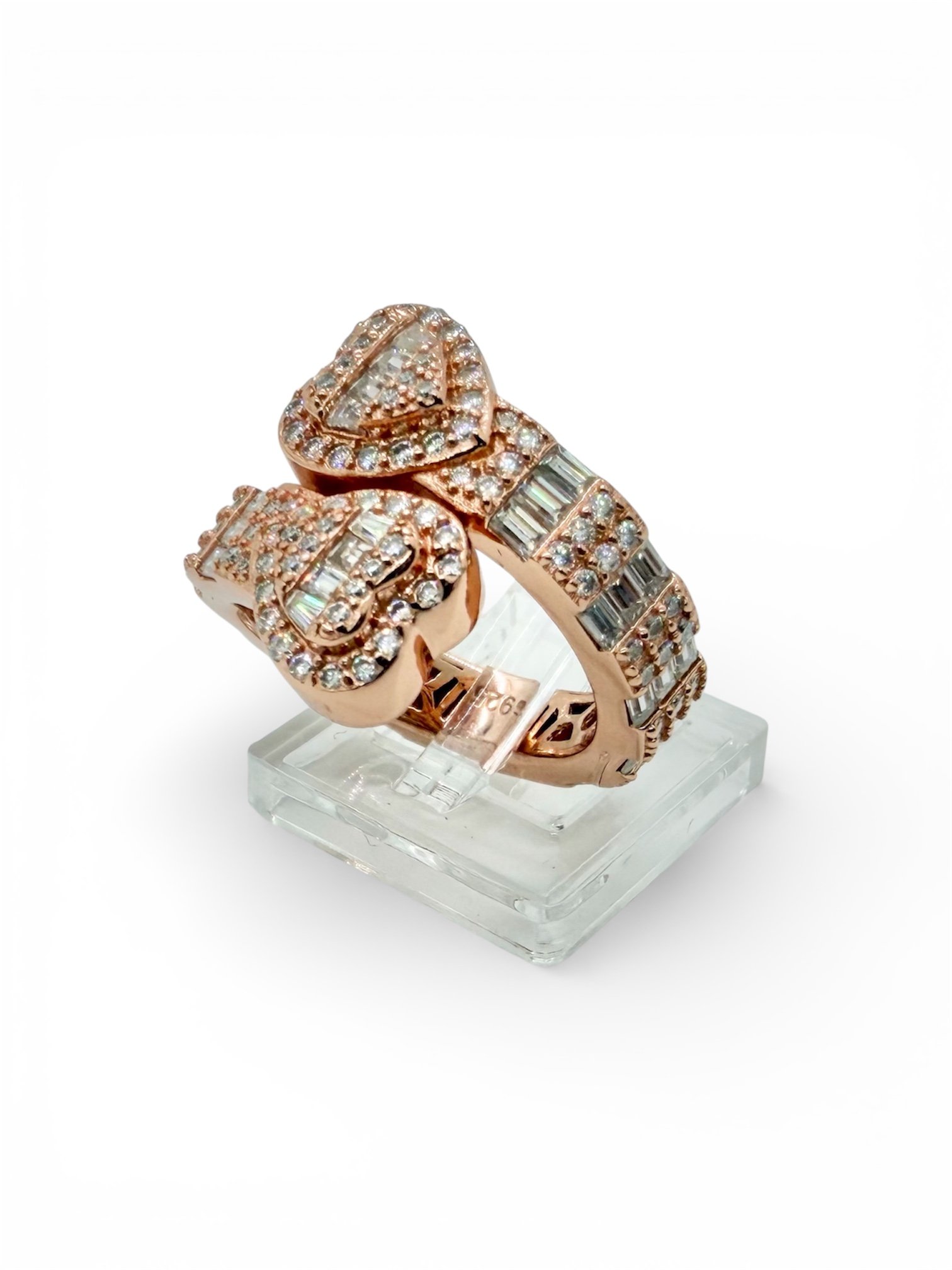 Elegancia y brillo en una sola pieza. Este impresionante anillo estรก elaborado en plata s925 rosa y decorado con deslumbrantes piedras Moissanite, reconocidas por su brillo intenso y apariencia similar al diamante.